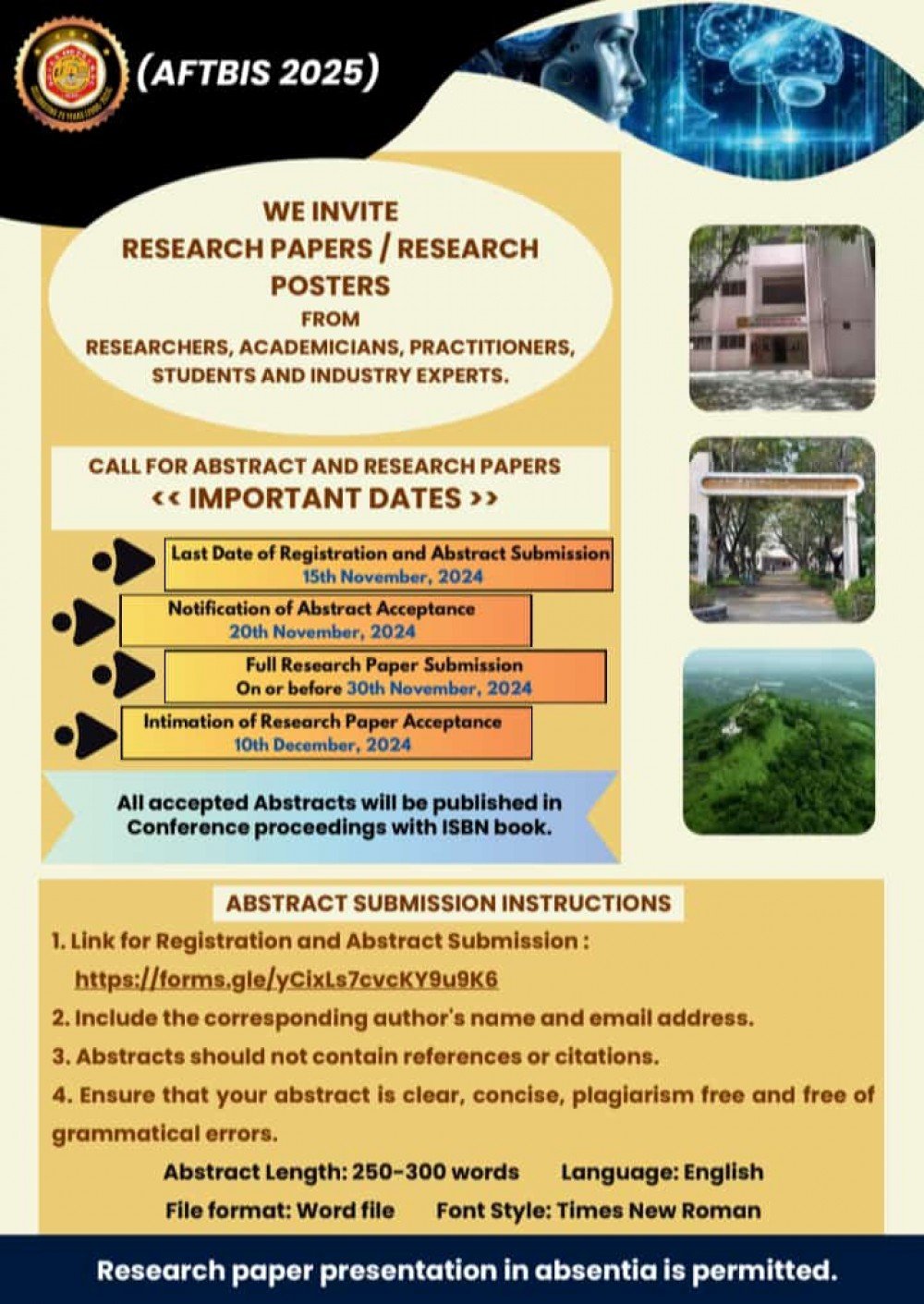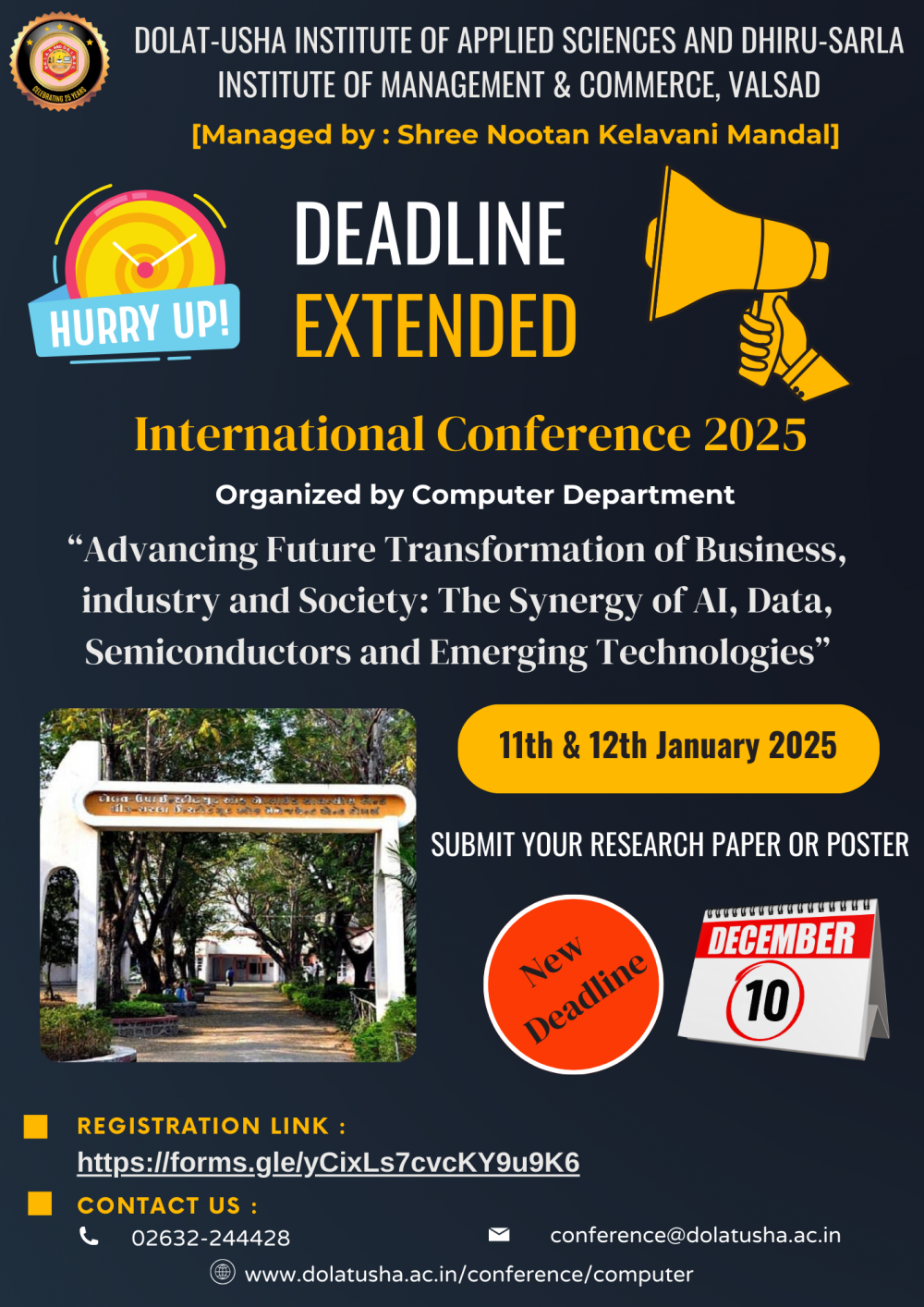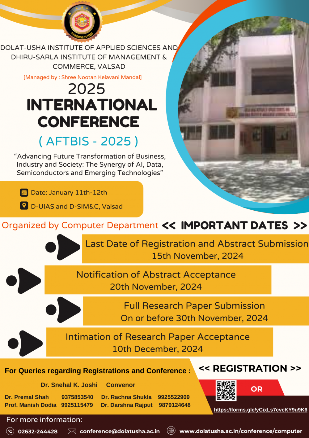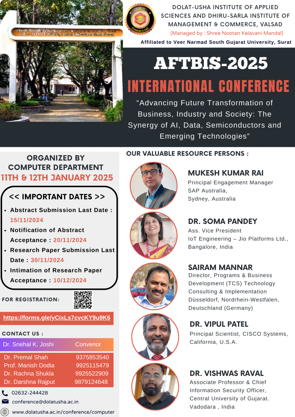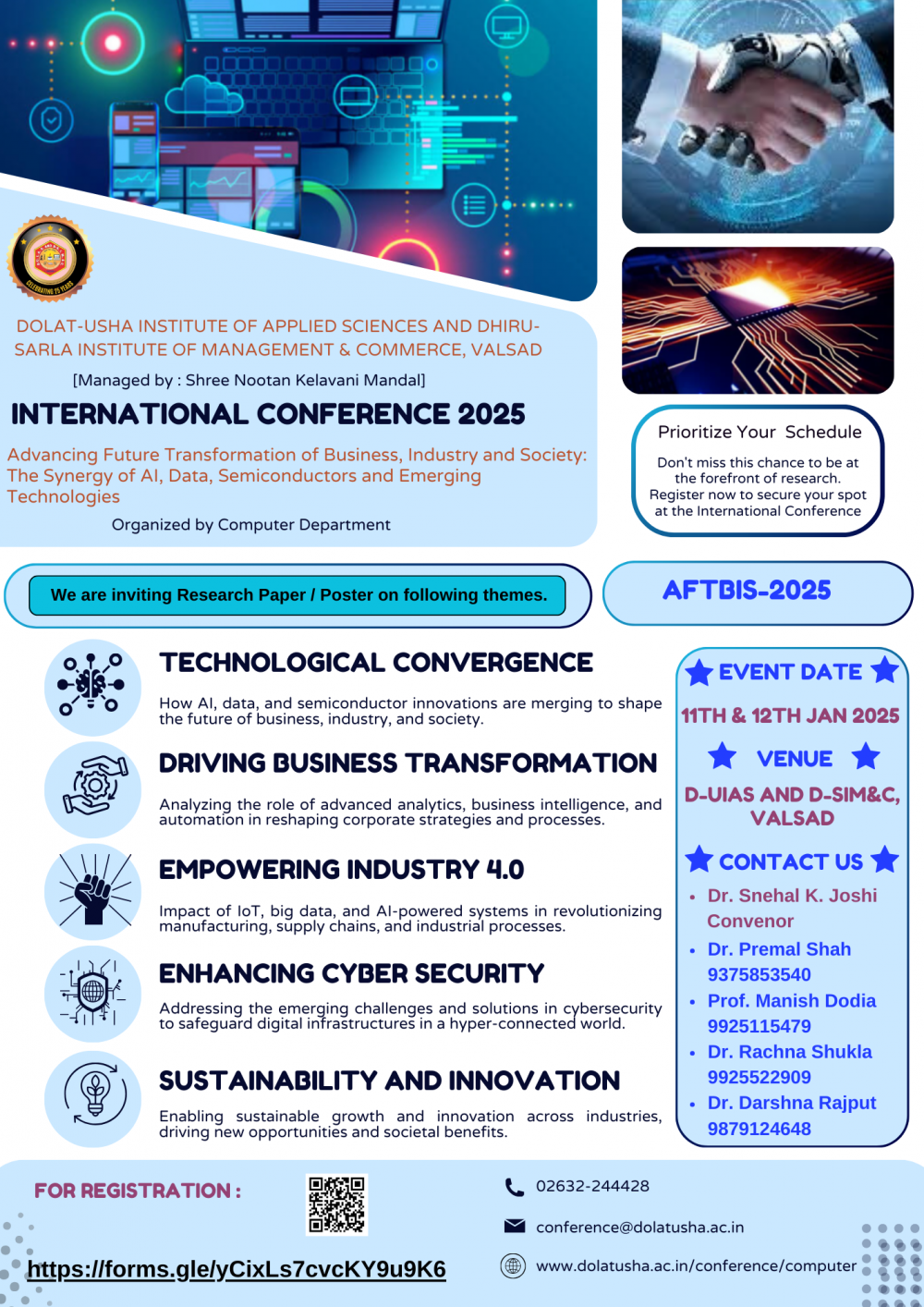The "Advancing Future Transformation of Business, Industry, and Society: The Synergy of AI, Data, Semiconductors, and Emerging Technologies" conference is a premier national-level event designed to bring together experts, innovators, and thought leaders from academia, industry, and government. The conference will focus on exploring cutting-edge advancements in Artificial Intelligence, Data Science, Data Analytics, Business Analytics, Business Intelligence, IoT, Semiconductors, Big Data, Cloud Computing, and Cyber Security. Through keynote sessions, panel discussions, and technical presentations, attendees will have the opportunity to engage in insightful dialogues about how these emerging technologies are transforming business processes, industrial applications, and societal systems. Participants will gain deep insights into the integration of AI with semiconductor technologies and the role of data-driven intelligence in shaping smart and sustainable solutions for the future. This conference is a unique platform for fostering collaboration, sharing knowledge, and addressing the key challenges and opportunities in the rapidly evolving landscape of digital transformation and technological innovation.